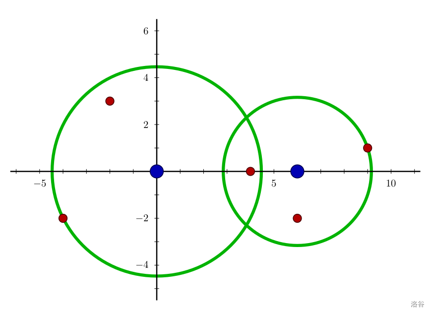 样例中的导弹拦截系统和导弹所在的位置如下图所示。要拦截所有导弹,在满足最小使用代价的前提下,两套系统工作半径的平方分别为20和10。